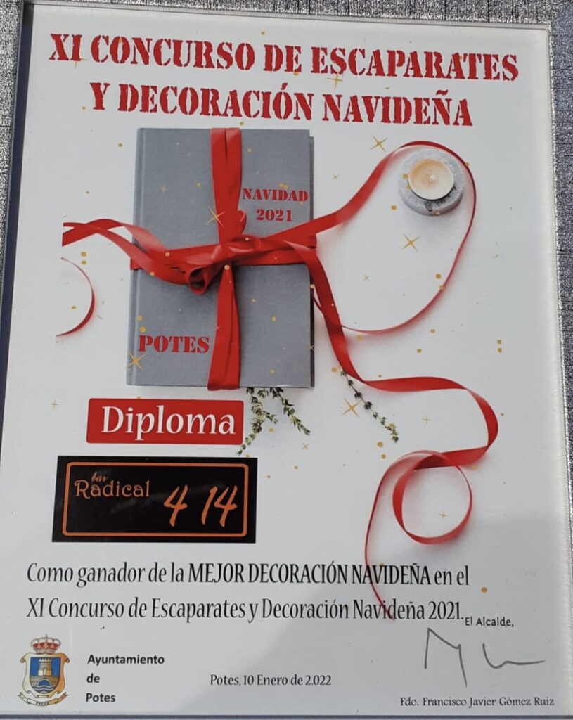 El premio a la mejor decoración navideña, en establecimientos hosteleros ha sido para Pub Radical 4.14, recogiendo el premio, Pablo Baizán y Mar Prieto, encargados de decorar el local, que también recibió 150 euros y diploma.