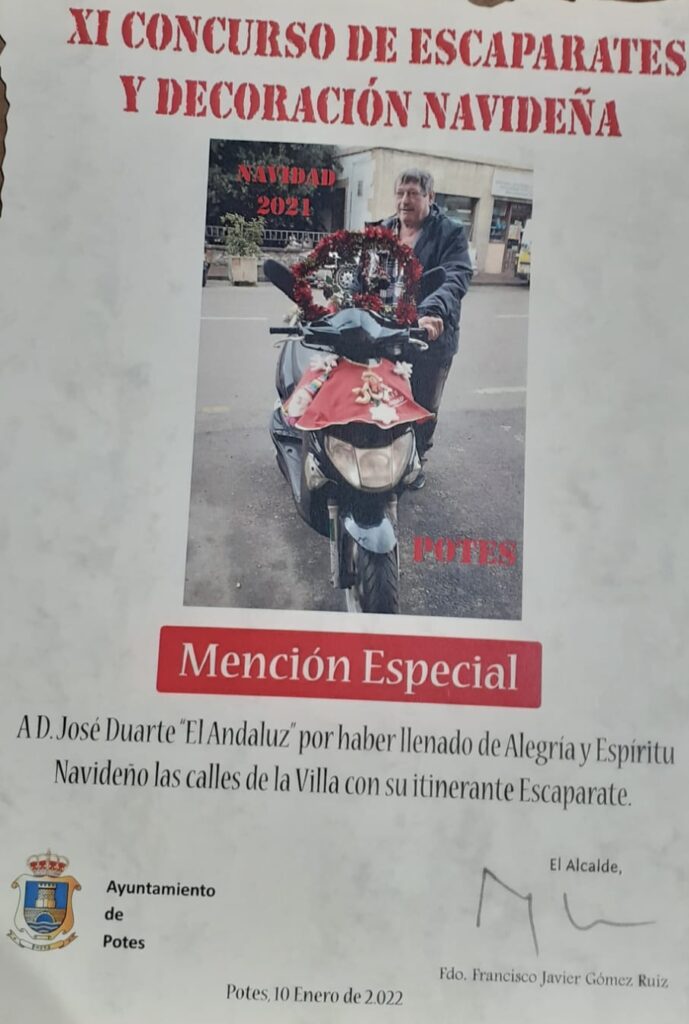En esta ocasión, se ha hecho entrega de un premio con mención especial a José Duarte “El Andaluz” por haber llenado de alegría y espíritu navideño las calles de la villa con el itinerante escaparate decorando su moto.