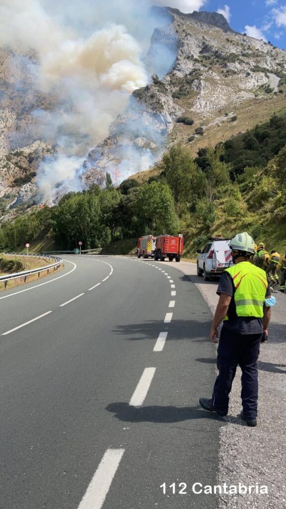 Eran poco antes de las 14.00 horas de hoy cuando se produjo un incendio en la entrada del Desfiladero de la Hermida, en las canales de Peña Ventosa, que ha descendido hasta las inmediaciones de la N-621, en la salida de la localidad de Castro-Cillorigo.