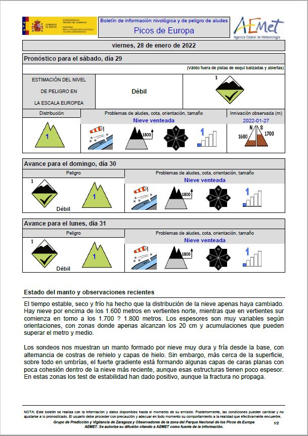 La Agencia Estatal de Meteorología (Aemet) ha avisado de riesgo débil de aludes en Picos de Europa hasta el domingo, por lo que el Servicio de Emergencias 112 recomienda extremar la precaución.