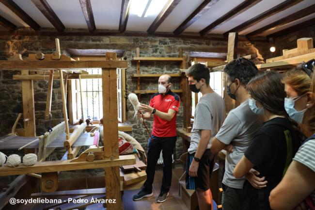 Los guías Darío Herrero y Virginia Fernández, de Naturea Cantabria en Liebana, inician el recorrido en los bajos del Ayuntamiento de Cabezón de Liébana. Allí, un grupo reducido de visitantes va a seguir las explicaciones, junto a los dos telares que se conservan en el interior del edificio. “Esta actividad se realizó hasta el año 1982 en esta localidad. Al telar llegaba la lana de las ovejas, después de que se lavara, escarmenaba, cardaba e hilaba-explican-. El proceso complicado se iniciaba aquí, en el telar, donde se tejía para conseguir las mantas, alforjas o escarpines, que posteriormente se debían de trasladar hasta la pisa”. Darío, también en su explicación intercala dichos populares como “Hilando poco se gana, pero mirando, nada”.